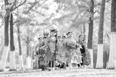 11月10日,浙江省湖州市長興縣開發區實驗幼兒園組織孩子們參加勞動實踐,撿拾落葉,制作成環保樹葉披風、樹葉發箍等服裝裝飾,在金黃色的銀杏林里邊秀邊舞,觸摸大自然。譚云俸 攝