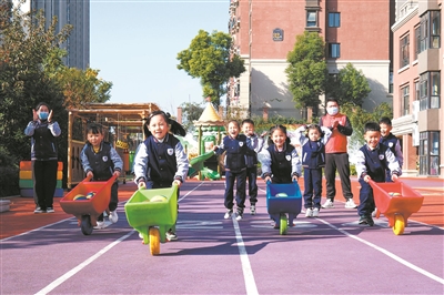 11月15日,在安徽省合肥市廬陽(yáng)區(qū)林店街道麗水社區(qū)華美幼兒園,社區(qū)志愿者與教師帶領(lǐng)孩子們?cè)诓賵?chǎng)玩游戲。