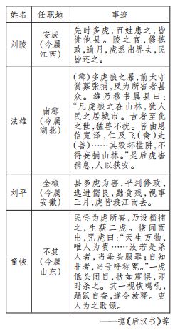 其次,從史料中提取有效信息。要通過閱讀材料知曉,東漢虎患產生的原因是什么,東漢良吏是如何治理虎患的。史料把虎患的成因歸結為“多虎”“賞募張捕”,即老虎的自然繁殖、官吏的不當處置。良吏治理虎患的措施包括“修德政”“至化”“恩信”“仁及飛(禽)走(獸)”“選進儒良”“唯人為貴”等,即改善社會治理,促進人虎和諧共處。但材料中的某些現象在現實生活中是不可能存在的,比如“虎悉出界去”“虎皆渡江而去”“垂頭服罪”“號呼稱冤”“狀如震懼”“視恢鳴吼”等。