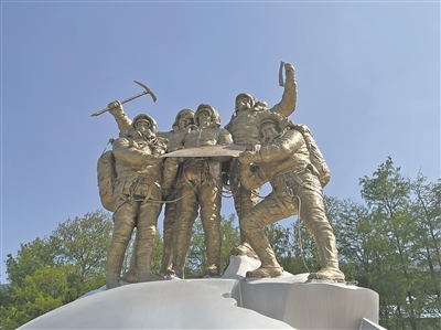 從遠處看,這尊名為《攀登》的雕塑高大雄偉,上半部分的攀登者雕像,由五名登山科考隊員組成,雕像中,有的高舉冰鎬,有的手持“登山隊”的隊旗。每個雕像看上去神采奕奕,他們注目遠方,眼神里充滿自信。而雕塑的下半部分,是一個具有現(xiàn)代風格的不銹鋼地球穹頂造型。穹頂?shù)膬?nèi)部,則是聲光電的裝置,若是晚上來參觀,整個雕塑顯得“光彩照人”。