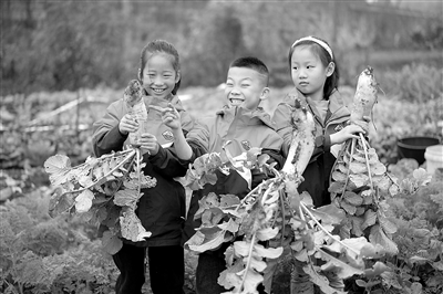 浙江省金華市武義縣壺山小學學生化身“小菜農(nóng)”體驗蔬菜采摘。在菜地,學生攥著一把葉子一個個拔起蘿卜,體會勞動人民的艱辛與豐收的樂趣。 徐曉奕 攝
