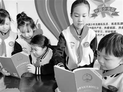 今年12月4日是第九個(gè)“國家憲法日”,也是我國現(xiàn)行憲法公布施行40周年。為大力弘揚(yáng)憲法精神維護(hù)憲法權(quán)威,連日來,青島市大中小學(xué)紛紛開展“學(xué)憲法、講憲法、遵憲法”系列教育活動。圖為青島上清路小學(xué)學(xué)生在閱讀憲法讀本。本報(bào)記者 孫軍 攝