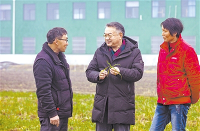 “你看這邊,葉尖有些發黃干枯了。”“這片苗長得比較弱,可以適當噴施葉面肥?!弊哌M小麥新品種優質高產精準調控技術示范田,農業農村部小麥專家指導組成員、揚州大學農學院教授朱新開習慣性地查看起小麥的長勢,和種植戶王友設、張紅女聊了起來。