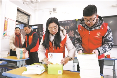 1月30日,在河南省寶豐縣山河路小學,教師在清點教材。新學期開學臨近,各地書店、學校積極做好教材和教輔資料的清點、搬運、分發等工作,為開學做好準備。何五昌 攝(新華社發)