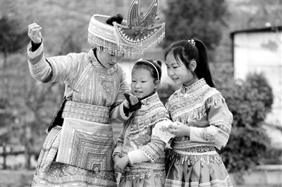 2月6日,小朋友在貴州省黔西市漁塘村新時代文明實踐站的院壩里學刺繡。周訓超 攝