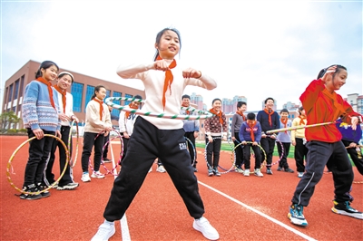 2月7日,江蘇省海安高新區實驗小學的孩子們課間在做運動。新學期伊始,該校孩子們在老師的組織下開展豐富多彩的體育游戲活動,盡享快樂校園時光。