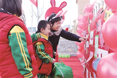 ③天津市薊州區(qū)第一幼兒園小朋友和園長媽媽一起貼心愿卡。薊宣 攝