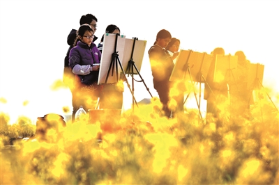 2月21日,一群學生在江西省樟樹市永泰鎮(zhèn)官湖村油菜花海中寫生。隨著天氣回暖,當?shù)赜筒嘶ǜ傁嗑`放,吸引了眾多學生前來觀賞、寫生。 新華社發(fā)(周亮 攝)