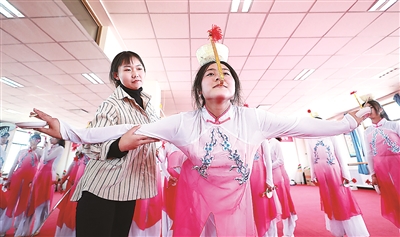 近日,甘肅省張掖市民樂縣職業教育中心學校教師在指導學前教育專業學生練習“非遺”頂碗舞。學校建成“非遺”傳承基地、民間藝人工作室,定期給學生授課,有效提升了學生的人文素養。本報記者 張學軍 鄭芃生 攝