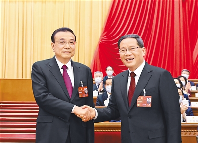 三月十一日,十四屆全國人大一次會議在北京人民大會堂舉行第四次全體會議,根據國家主席習近平的提名,經過投票表決,決定李強為中華人民共和國國務院總理。這是李強同李克強握手。新華社記者 黃敬文 攝