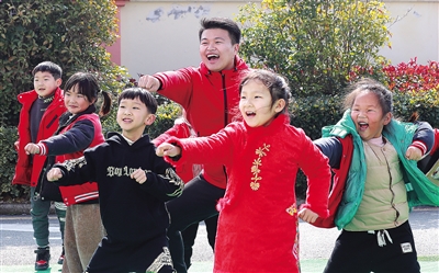 春天的江蘇省鹽城市鹽都區尚莊中心幼兒園,小草露出了新芽,迎春花兒在風中搖曳,孩子們的歡聲笑語也隨風兒飄出幼兒園。陪伴孩子們一起游戲的是一名男幼師。他是徐州幼兒師范高等專科學校畢業生、園長陳小龍。