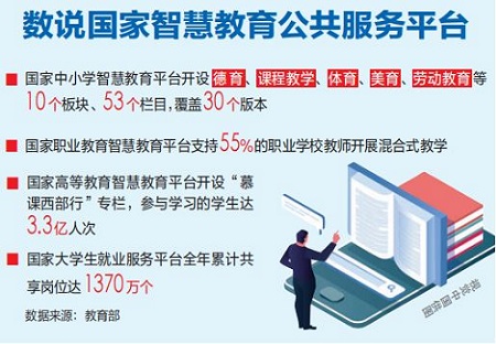 基礎(chǔ)教育方面,國家中小學智慧教育平臺匯聚全國最優(yōu)質(zhì)的基礎(chǔ)教育數(shù)字資源,截至2023年2月,平臺已開設(shè)德育、課程教學、體育、美育、勞動教育等10個板塊、53個欄目,覆蓋30個版本,還提供了“雙師課堂”等多種應(yīng)用模式,幫助農(nóng)村地區(qū)開足開齊開好國家規(guī)定課程,讓遠在邊疆、身處農(nóng)村的孩子和大城市的孩子“同上一堂課”。