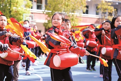 3月30日,湖北省襄陽市萬戶小學學生在課間學打腰鼓。該校為豐富校園文化生活,將腰鼓作為特色健身項目引入學校,每天利用大課間教學生練習,在健身的同時傳承傳統文化。付曉方 攝