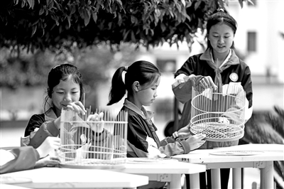 4月18日,貴州省黔西市甘棠鎮甘棠小學的學生在體驗傳統鳥籠的制作。近年來,甘棠小學開展“傳統鳥籠文化進校園”主題活動,遴選精通鳥籠制作的教師為學生們講解和演示鳥籠制作,讓他們近距離感受傳統文化。