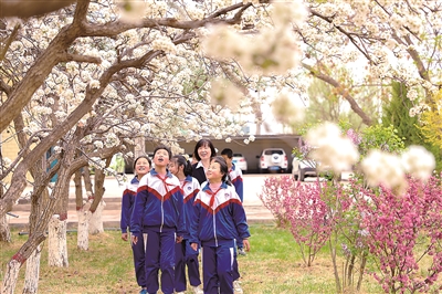 4月23日,甘肅省臨澤縣平川鎮中心小學師生在校園內欣賞盛開的梨花。近日,該校紅領巾生態文化園內,一樹樹梨花潔白似雪、清新淡雅,一枝枝桃花色彩艷麗、美出詩意,吸引師生前來踏青賞花。