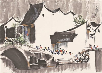 吳冠中水墨畫《雙燕》中,雙飛的燕子低掠過黑色線條畫就的屋檐,屋檐下白墻垂掛下來,倒映在明鏡般的水面上。《雙燕》的主體是江南水鄉黑白世界的想象,黑色的門窗、黑色的飛檐,點綴在大片的白墻上,寧靜的空間和飛動的燕子,組成了吳冠中魂牽夢繞的故鄉場景。《雙燕》完成于1981年的一次江南偶遇,在此前一年完成的素描寫生《寧波水鄉》(1980)中,與《雙燕》中類似的建筑圖案占據了整幅繪畫的一半,另一半則是勾滿了水波紋的村鎮水道,倒映在水中的垂柳也變成無數彎曲的線,猶如夢幻中飛旋的印象。如果說白居易的“日出江花紅勝火,春來江水綠如藍”為我們留下了古典江南色彩旖旎的想象形式的話,那么吳冠中的江南黑白則以素雅之美重構了我們今天對江南的記憶。江南在吳冠中心中是對故鄉的依戀;對普通人而言,江南是平鋪的黑白,是宣紙上的墨色點染,是無限的美好在心中升騰飛旋。