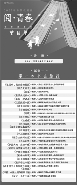 編者按 為深入貫徹落實黨的二十大關于深化全民閱讀活動的重要部署,進一步推動全國青少年學生閱讀,第28個世界讀書日,中國教育報推出大型伴讀活動,引導青少年學生愛讀書、讀好書、善讀書。在線上,世界各地的中國師生,在代表性地標、書房中、教室里領讀經典篇章,分享閱讀感悟。在線下,中國教育報記者走進國家圖書館以及多所高校,邀請小讀者與大學生們朗讀經典作品,推動青少年學子愛上閱讀。本期專刊聚焦此活動,并約請伴讀人向青少年發出讀書寄語,意在進一步發揮名師在推動閱讀中的重要角色和作用。