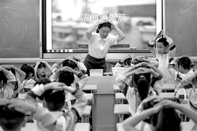 5月10日,在福建省福州市鼓樓區安泰街道烏山小學,教師正在教孩子們震時避險知識和自救技能。在全國防災減災日來臨之際,該校組織開展防災減災主題教育活動,通過普及地震、火災等防范和自救知識,開展情景現場表演,強化學生安全意識、提高自救自護能力。