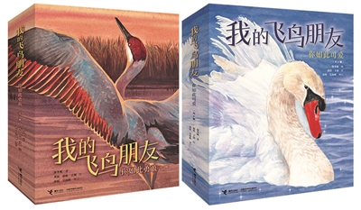 在圖畫書里,每本書都有大主角,它們分別是:北京雨燕、丹頂鶴、綠孔雀、朱鹮、冠斑犀鳥、長耳鸮、火烈鳥、疣鼻天鵝。它們棲息地各不相同,生境和習性都不同。書中的配角也大有看頭,不僅有國家一級保護動物白鷴、黑頸長尾雉,也有大天鵝、小天鵝、中華秋沙鴨、鴛鴦、百靈等50多種鳥,可以說是一本入門級的鳥類圖畫書。
