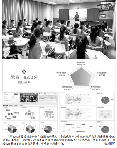 這種指向教師能力發展AI測診的環境,集傳統課室、視頻錄播、數據采集、數據呈現等功能于一體,實現AI課堂分析數據實時呈現,可以生成教師課堂教學能力AI測診報告,輔助專家教師指導、名師名校長聽評課、學校教研備課、師范生實踐教學改進等需要,推動了教師反思和教育教學行為的規范提升。目前,在“師范教育協同提質計劃”中,已建成10個這樣的標準化“智慧教室”。