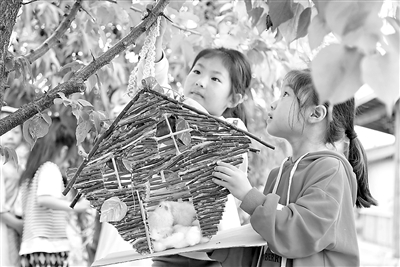 近日,江蘇省海安市墩頭鎮(zhèn)仇湖幼兒園的孩子將制作的“鳥巢”掛在樹上。當(dāng)日,該園開展“保護(hù)環(huán)境 從我做起”主題教育活動,通過環(huán)保時裝秀、垃圾分類、變廢為寶手工制作、撿拾垃圾等環(huán)節(jié),將節(jié)約資源、綠色低碳的理念播撒在孩子們心中。周強 攝