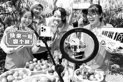 近日,在江蘇省鎮(zhèn)江市丹徒區(qū)江心洲生態(tài)農(nóng)業(yè)園區(qū)益平村的桃園里,江蘇大學(xué)志愿者幫助果農(nóng)直播推銷油桃,助力鄉(xiāng)村振興。石玉成 攝