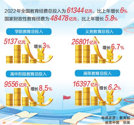 本報北京6月30日訊(記者 林煥新)記者今天從教育部獲悉,近日發布的2022年全國教育經費執行情況統計快報顯示,2022年全國教育經費總投入為61344億元,比上年增長6%。其中,國家財政性教育經費為48478億元,比上年增長5.8%。2022年全國學前教育、義務教育、高中階段教育、高等教育、其他教育經費總投入分別為5137億元、26801億元、9556億元、16397億元、3454億元,比上年分別增長3%、6.7%、8.5%、6.2%、-1.8%。
