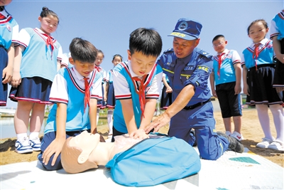 近日,在山東省臨沂市沂南縣界湖公園,救援隊志愿者為學生講解心肺復蘇急救知識。暑假來臨,當地各中小學開展暑期防溺水安全教育活動。志愿者們通過講解防溺水知識、傳授安全急救技能、開展警示教育等形式,提升學生的安全意識和自救能力。王彥冰 丁曉彤 攝