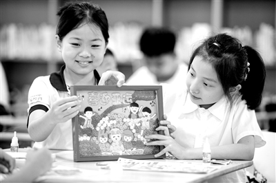 近日,在浙江省湖州市長興縣夾浦鎮社工站,孩子們在裝裱自己制作的亞運主題紐扣畫。暑期,當地開展愛心公益托班,當地大學生志愿者為轄區內雙職工子女、新居民子女進行為期一個月的日常看護,并開設公益課堂、非遺體驗、勞動實踐、紅色研學等豐富多彩的活動,讓孩子們度過安全、快樂、有意義的暑假。
