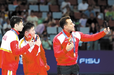 8月5日,男子吊環(huán)頒獎儀式結(jié)束,季軍土耳其選手阿西爾(右)掏出手機,與冠軍中國選手蘭星宇(中)、亞軍中國選手鄒敬園合影。