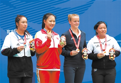 8月6日,在成都舉行的第31屆世界大學(xué)生夏季運(yùn)動(dòng)會(huì)網(wǎng)球女子單打決賽中,中國(guó)選手郭涵煜(左二)以2比1戰(zhàn)勝中國(guó)臺(tái)北選手楊亞依,奪得冠軍。