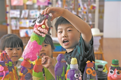 日前,浙江省諸暨市暨南街道街亭幼兒園的孩子們用各種彩泥制作成蝸牛、毛毛蟲、棒棒糖等,裝飾廢舊瓶子、扇子,培養了動手能力和想象力,提升了環保意識。圖為孩子們在展示用彩泥裝飾的瓶子。陳霞芳 攝