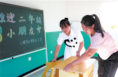近日,河北省淶水縣三坡學區愛心小學教師在布置教室,迎接受災學校轉學學生的到來。
