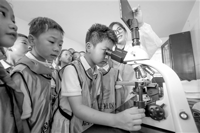 近日,浙江省湖州市德清縣武康街道組織當地各校40多名小學生走進德清縣污水處理教育基地,通過近距離實地考察,深入了解污水處理的全過程,增強保護生態環境的意識。圖為小學生借助顯微鏡觀察活性污泥中的微生物,直觀地了解各種微生物的名稱和形狀。通訊員 王正 攝
