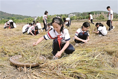 9月4日,湖南省邵陽市洞口縣黃橋鎮(zhèn)黃橋村,學(xué)生在撿拾被收割機(jī)遺漏的稻穗。黃橋鎮(zhèn)中心小學(xué)組織學(xué)生到附近收割后的稻田里撿拾散落的稻穗,培養(yǎng)學(xué)生熱愛勞動、珍惜糧食、厲行節(jié)約的良好習(xí)慣。