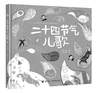 “節氣里的詩意氣韻”這個表達來自薛衛民的一篇短文。這位對二十四節氣保持著長久的興趣和關注的作者,曾深情地凝視節氣文化,嘗試將“萬物有靈”的浪漫和“春華秋實”的質感以兒歌的方式予以呈現。其實,自2016年入選世界非文化遺產名錄以來,二十四節氣已成為童書中極為熱門的表現內容。在這樣的背景下,《二十四節氣兒歌》要將耳熟能詳的“春雨驚春清谷天,夏滿芒夏暑相連。秋處露秋寒霜降,冬雪雪冬小大寒”轉化為兒歌,“用文學的光,讓孩子看得更遠”,分明是對寫作智慧和文字功力的考驗和挑戰。