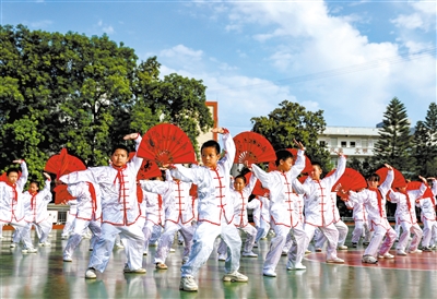 9月15日,四川省華鎣市祿市鎮占云小學的學生在大課間練習“太極功夫扇”。該校把武術引入校園,開設太極扇、太極拳等課程,增強學生體能,陶冶學生情操,鞏固“雙減”成果。邱海鷹 攝