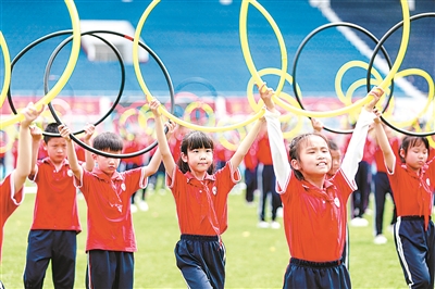 近日,湖北省襄陽市人民路小學(xué)學(xué)生正在進行呼啦圈運動展示。該校1000多名學(xué)生在襄陽市體育場進行了“千人呼啦圈”大課間體育匯報展演,慶祝亞運會舉辦。聶志鵬 攝