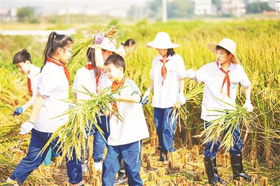 10月15日,安徽省蕪湖市繁昌區繁陽鎮城關一小,教師組織學生去校外勞動基地開展水稻收割勞動實踐活動?;顒拥拈_展讓同學們感受到豐收的喜悅,同時也體會到糧食的來之不易。田園園 攝