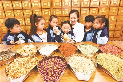 10月19日,江蘇省連云港市東??h中醫院中藥師向西雙湖幼兒園孩子演示怎樣使用搗中藥的沖筒。在10月22日第33個“世界傳統醫藥日”到來之際,西雙湖幼兒園開展以“學中醫、認中藥、感受中國傳統文化”為主題的教育活動,讓孩子們感受中醫藥傳統文化魅力。張玲 攝