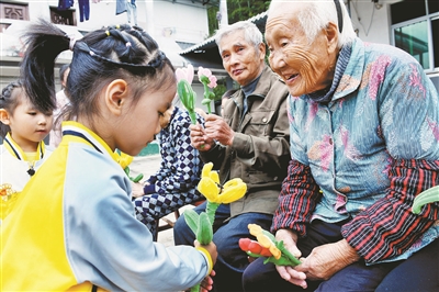 近日,江西省德興市銅礦幼兒園大班的孩子在教師的陪同下,來到該市泗洲鎮(zhèn)敬老院,為這里的爺爺奶奶送去慰問蛋糕、牛奶和節(jié)日的問候。在重陽節(jié)到來之際,該園開展“九九重陽節(jié) 濃濃敬老情”走進敬老院社會實踐活動,孩子們?yōu)榫蠢显豪锏臓敔斈棠瘫硌萘烁栉?、花樣拍球、跳繩等節(jié)目,將滿滿的愛意送到爺爺奶奶的手中。