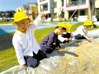 秋天稻谷飄香,為了讓孩子們體驗豐收的喜悅,日前,浙江省武義縣白陽幼兒園開展了收割稻谷勞動實踐活動。孩子們和老師一起割稻谷、拾稻穗、打稻谷,他們開動腦筋,用輪胎、梯子、洗衣板等材料完成了稻谷的脫粒,把一顆顆金黃色的谷粒收集到一起晾曬。幼兒園供圖