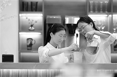 ①在調酒咖啡坊,兩名學生配合完成奶茶的制作,這里的奶茶特別受追捧。