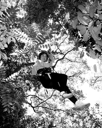 記者在采訪過程中看到,上課時,學生要學會借助繩索,爬到20多米高的樹上。