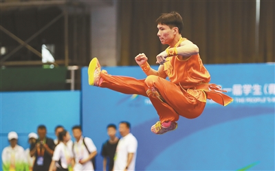 11月6日,首屆學青會武術套路(校園組)大學男子組自選南拳項目決賽舉行,這是運動員在比賽中。