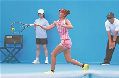 11月8日,第一屆學青會網球女子團體決賽在廣西體育中心網球中心進行,北京東城區隊2∶0擊敗武漢隊,奪得學青會網球賽的首塊金牌。圖為北京東城區隊張筠涵在比賽中。