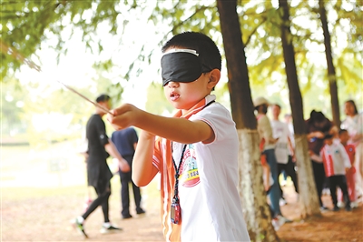 頂“蘑菇”、抖抖樂、松果傳遞……近日,湖南長沙松雅湖濕地公園變身“運動場”,來自長沙師范學院附屬第二幼兒園的1300余名幼兒、教師、家長,在這里與大自然親密“相擁”,開展戶外親子徒步活動,強健體魄、增進感情。圖為幼兒參與“森林盲行”。