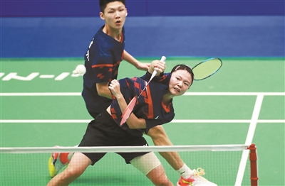 11月11日,第一屆學青會(公開組)羽毛球賽決賽在廣西南寧進行,在混合雙打對決中,來自廣州隊的高家炫和李茜以2∶0戰勝來自長沙隊的毛哲和劉圓圓,獲得冠軍。圖為高家炫和李茜在比賽中。本報記者 張學軍 攝