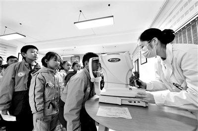 近日,在湖北省襄陽市保康縣城關鎮土門小學,眼科醫生為學生做視力篩查。該校邀請眼科醫生入校,幫助學生及時發現視力問題并采取預防和治療措施,提高學生愛眼意識。楊韜 劉國清 攝