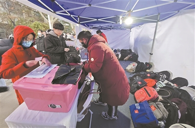 在中國(guó)傳媒大學(xué),考場(chǎng)教學(xué)樓前支起幾十個(gè)帳篷,每個(gè)帳篷上標(biāo)記著考場(chǎng)號(hào)碼,方便學(xué)生擺放書(shū)包時(shí)“對(duì)號(hào)入箱”,每個(gè)帳篷里還配備了專門(mén)的志愿者負(fù)責(zé)引導(dǎo)和服務(wù),每名考生都有一個(gè)印著考場(chǎng)和座位號(hào)的貼紙,一式兩份,考生取包時(shí)需要出示號(hào)碼取走物品。